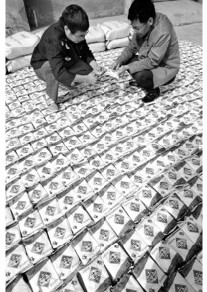 今年5月起,蒙城縣鹽務局鹽政稽查大隊和公安部門聯手,歷時5個多月,破獲一起加工銷售假冒綠色食品鹽的團伙案,抓獲違法犯罪嫌疑人12人,案件涉及假冒綠色食品鹽600余噸。該案涉及皖蘇豫三省以及蒙城、亳州等六縣(市),時間跨度達6年之久。圖為11月6日,蒙城縣鹽政執法人員在查看清點收繳的私鹽。